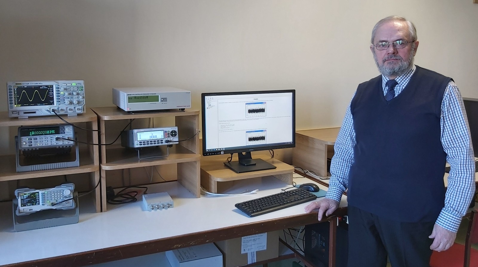 W zakończonym w 2019r pierwszym etapie przygotowania do akredytacji uruchomione zostało stanowisko do wzorcowania częstościomierzy, czasomierzy i generatorów. Główną częścią tego stanowiska jest zestaw referencyjnego częstościomierza, składający się z rubidowego atomowego wzorca częstotliwości dyscyplinowanego sygnałem GPS, analizatora czasu i częstotliwości wyposażonego w kwarcowy generator podstawy czasu pracujący ze stabilizacją temperatury oraz wzmacniacza dystrybucyjnego. Rubidowy wzorzec częstotliwości posiada kilka wyjść częstotliwości wzorcowej 10 MHz, dlatego może być wykorzystany nie tylko jako zewnętrzne źródło sygnału podstawy czasu dla analizatora czasu i częstotliwości, ale także jako źródło sygnału referencyjnego dla innych przyrządów działających w laboratorium lub poza nim. Jedno z wyjść wzmacniacza dystrybucyjnego umożliwia przesłanie referencyjnego sygnału 10 MHz za pomocą światłowodu na odległość do 2 km.